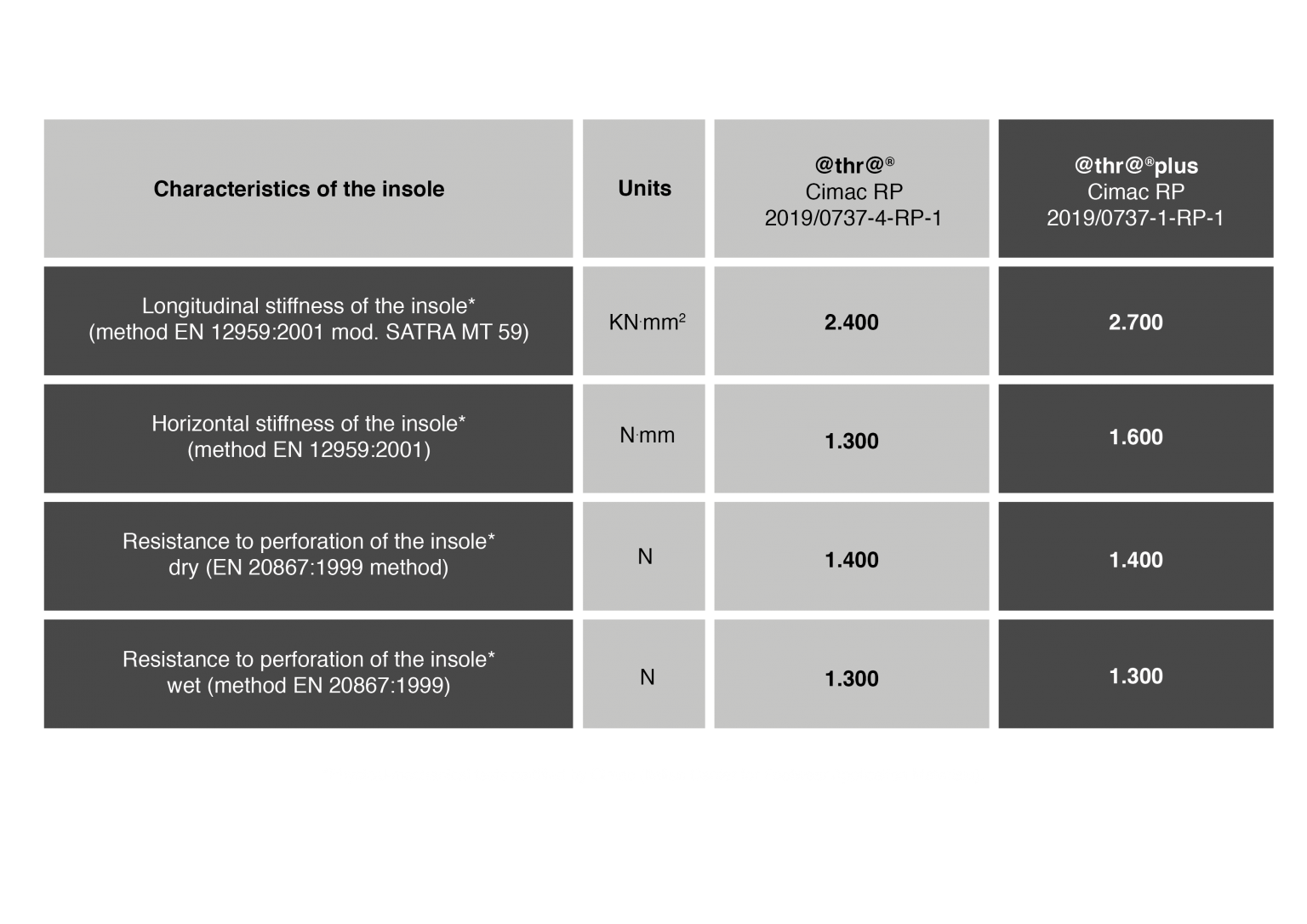 Ten years after the launch of @thr@®, thanks to the ongoing work of the R&D department in collaboration with Kiefer Von Zoe®, we have further improved the high-quality insole that we are known for, creating the @thr@®plus. By replacing both layers of KPB with NPU Green, we have improved the insole’s performance by 12.5% longitudinally and 23% crosswise (the more important of the two as it gives the shoe greater stability). The chart below contains more details about the tests that were conducted, under identical conditions, on @thr@ e @thr@®plus:
